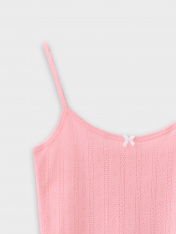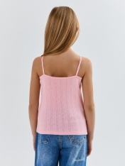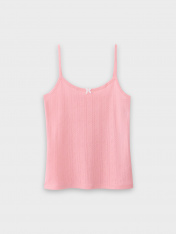 Топ прилигающего силуэта длиной чуть выше середины бедер. Верхний край спинки, бретели, срезы пройм окантовы бейкой. Перед и спинка цельнокроеные. Низ застрочен на 2-хигольной плоскошовной машине швом вподгибку с открытм срезом