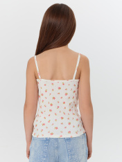 Топ прилигающего силуэта длиной чуть выше середины бедер. Верхний край спинки, бретели, срезы пройм окантовы бейкой. Перед и спинка цельнокроеные. Низ застрочен на 2-хигольной плоскошовной машине швом вподгибку с открытм срезом
