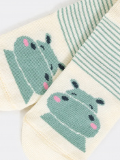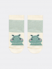 Носки детские из высококачественного хлопка с рисунком в виде бегемота. Натуральные волокна отлично пропускают воздух и впитывают влагу, дарят ощущение комфорта в течение дня. Благодаря небольшому количеству эластана в составе, носки удобно сидят наножке и не сползают, хорошо тянутся и легко надеваются. Пятка и мысок дополнительно укреплены для защиты от протирания. Резинка мягко, но надежно удерживает носки, не оставляя на коже следов. Рекомендуем!