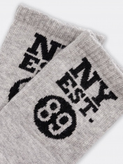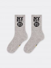 Носки детские из высококачественного хлопка с высокой резинкой и рисунком в виде надписи "NY EST. 89". Натуральные волокна отлично пропускают воздух и впитывают влагу, дарят ощущение комфорта в течение дня. Благодаря небольшому количеству эластана всоставе, носки удобно сидят на ножке и не сползают, хорошо тянутся и легко надеваются. Пятка и мысок дополнительно укреплены для защиты от протирания. Резинка мягко, но надежно удерживает носки, не оставляя на коже следов. Эти носки точно понравятсявашей маленькой моднице. Рекомендуем!