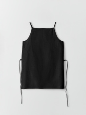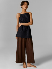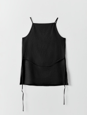 Блуза женская прямого силуэта на тонких бретелях. На детали переда застрочены вытачки. По боковым швам внизу обработаны разрезы. В районе талии по боковым швам вставлены петли под пояс из основного полотна. Нижний срез блузы обработан швом вподгибкус закрытым срезом._x000D_ _x000D_