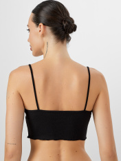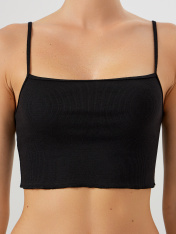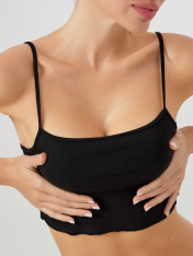 Стильный топ на тонких бретелях. Выполнен из хлопковой трикотажной рибаны в рубчик. Особенность модели – закрученный нижний срез. Идеальное решение для теплого времени года!