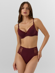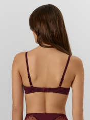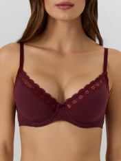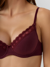Бюстгальтер женский бордовый — это модель, в которой каждая деталь продумана для вашего комфорта и уверенности. Мягкие формованные чашки с внутренним каркасом бережно поддерживают грудь, сохраняя естественную форму. Верх чашек украшен нежным эластичным кружевом, которое прилегает к коже и не натирает даже при длительной носке.<br>_x000D_ <br>_x000D_ Ластовица в центральной части выполнена из дышащего хлопка с мягкой подкладкой, что обеспечивает гигиеничность и комфорт. Боковые части эластичны и не давят. Двойная застежка на спине надежно фиксирует бюстгальтер, а регулируемые бретели с пластиковыми колечками позволяют точно подогнать длину под ваши параметры.<br>_x000D_ <br>_x000D_ Все края изделия обработаны упругой резинкой, которая не растягивается со временем и сохраняет форму. Кружево по верху чашек уложено с небольшим отступом, создавая эффект воздушности и элегантности. <br>_x000D_ <br>_x000D_ Этот бюстгальтер идеален для повседневной носки: он остается невидимым под обтягивающей одеждой, не сковывает движений и подчеркивает естественную красоту._x000D_