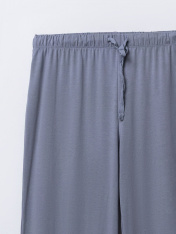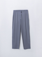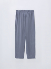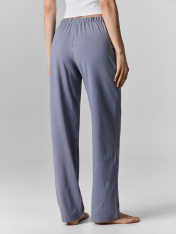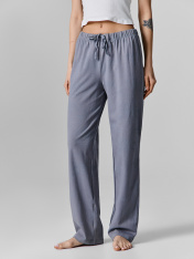 Брюки прямого силуэта, немного заужены к низу. Пояс цельнокроеный с резиной внутри 30RV. По центру пояса пробиты петли, протянута хб тесма 10мм. Низ брюк обработан в подгибку._x000D_