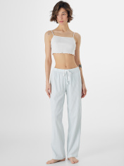 Брюки прямого силуэта, немного заужены к низу. Пояс цельнокроеный с резиной внутри 30RV. По центру пояса пробиты петли, протянута хб тесма 10мм. Низ брюк обработан в подгибку._x000D_