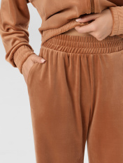 Серые велюровые брюки станут любимым предметом для комфортного отдыха дома в прохладное время года. Модель свободного кроя с высокой посадкой на талии создает элегантный силуэт и обеспечивает комфорт в течение всего дня. <br>_x000D_ <br>_x000D_ Мягкий велюр приятен к телу и обладает легким блеском. Широкий пояс со встроенной эластичной резинкой не давит на талию, а две отделочные строчки добавляют модели аккуратности. Удобные карманы в боковых швах практичны для хранения мелочей.<br>_x000D_ <br>_x000D_ Брюки свободно спускаются вниз, создавая красивую линию до самого пола. Эта модель станет идеальным выбором для расслабленного времяпрепровождения, уединенного вечера или утреннего отдыха._x000D_