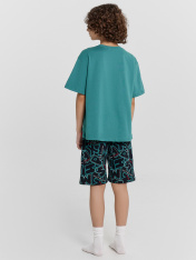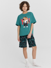 Этот домашний комплект для мальчиков — удобный и практичный выбор для отдыха и сна. Футболка свободного силуэта обеспечивает комфортную посадку. Круглая горловина с обтачкой из рибаны добавляет мягкости и эластичности, обеспечивая удобство при носке. Свободные рукава и слегка спущенная линия плеча создают расслабленный силуэт, а обработка низа рукавов и футболки швом в подгибку делает изделие аккуратным и долговечным. Шорты ниже колена свободного силуэта и с высокой посадкой на талии обеспечивают максимальное удобство, создавая ощущение свободы движений. Эластичный пояс мягко фиксирует изделие, а обработка низа шорт швом в подгибку делает модель надежной и устойчивой к износу. Этот комплект из натурального хлопка идеально подходит для домашних образов, сочетая комфорт, практичность и стиль!