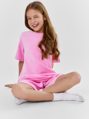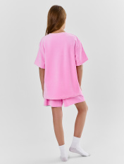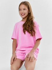 Джемпер прямого силуэта. Горловина круглой формы, обтачка из основного полотна . Рукава втачные свободные, линия плеча слегка спущена. Низ рукавов и низ джемпера в подгибку._x000D_ Шорты свободного силуэта. Пояс цельнокроеный внутри с резиной 40RV, отстрочен. Низ брюк в подгибку.