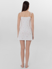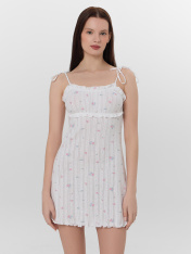 Ночная сорочка с принтом создает образ нежности и романтики. Полуприлегающий силуэт и длина выше колена обеспечивают комфорт во время сна и приятную легкость._x000D_ Глубокий U-образный вырез горловины подчеркивает женственность. Лиф модели отдельно выделен и оформлен изящной сборкой, закрепленной тонкой текстильной полоской. Бретели выполнены из основного материала в несколько слоев для прочности и комфорта. Спинка сорочки выполнена из единого отрезка, что обеспечивает гладкую посадку, а низ изделияобработан для сохранения формы.<br>_x000D_ <br>_x000D_ Фактура рибаны, выполненная из хлопка, дарит коже приятную мягкость и натуральную воздухопроницаемость. Нежный цветочный принт и кружевные декоративные элементы добавляют образу утонченности. <br>_x000D_ <br>_x000D_ Эта сорочка станет любимым выбором для спокойного отдыха, создавая ощущение заботы о комфорте каждую ночь._x000D_
