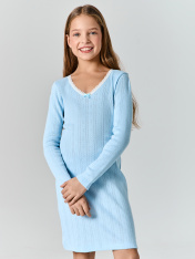 Сорочка полуприлегающего силуэта для девочек. Горловина V-образной формы, обработана кружевом Devsel L20166-1.5, ширина 15мм. Рукава длинные втачные, одношовные. Перед и спинка цельнокроеные. Низ изделия и рукавов обработаны на 2-х игольной плоскошовной машине швом в подгибку._x000D_ Декор по заданию - бантик (6737-0011А)