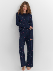 Домашний комплект с нежным узором создает атмосферу спокойного уюта. Этот гармоничный набор из лонгслива и брюк станет верным спутником ваших расслабленных вечеров и моментов отдыха._x000D_ Лонгслив свободного кроя с круглой горловиной и длинными рукавамиподарит ощущение невесомости. Брюки прямого силуэта с эластичным поясом мягко фиксируются на талии, не стесняя движений во время сна или домашних дел.<br>_x000D_ <br>_x000D_ Комплект выполнен из полиэстера с добавлением эластана. Такой состав обеспечивает прочность ткани и идеальное облегание, сохраняя форму после множества стирок. Материал обладает легкостью и мягкостью, даря приятные тактильные ощущения.<br>_x000D_ <br>_x000D_ Нежный синий цвет с изящным узором создает настроение гармонии и безмятежности. <br>_x000D_ Комплект идеален для спокойного сна, утреннего кофе или вечернего отдыха, сочетая в себе практичность и эстетику домашней одежды._x000D_
