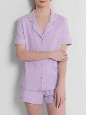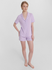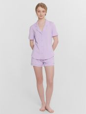 Женская пижама свободного силуэта создаст комфорт и стиль в вашем домашнем гардеробе. Рубашка прямого кроя с отложным воротником и лацканами, застегивающаяся на пуговицы, дополнена короткими рукавами для легкости и удобства. Свободные шорты длины мини с эластичным поясом и атласной тесьмой, которая завязывается на бантик, добавляют очарования и обеспечивают комфортную посадку. Контрастные канты на рукавах, воротнике и передней части рубашки подчеркивают уникальный стиль и добавляют изысканности. Эта пижама идеально подходит для сна, отдыха и домашних дел, предлагая вам комфорт и стиль в каждой детали. Рекомендуем для создания уютных и элегантных образов для дома!