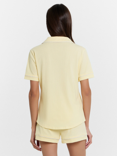 Женская пижама свободного силуэта создаст комфорт и стиль в вашем домашнем гардеробе. Рубашка прямого кроя с отложным воротником и лацканами, застегивающаяся на пуговицы, дополнена короткими рукавами для легкости и удобства. Свободные шорты длины мини с эластичным поясом и атласной тесьмой, которая завязывается на бантик, добавляют очарования и обеспечивают комфортную посадку. Контрастные канты на рукавах, воротнике и передней части рубашки подчеркивают уникальный стиль и добавляют изысканности. Эта пижама идеально подходит для сна, отдыха и домашних дел, предлагая вам комфорт и стиль в каждой детали. Рекомендуем для создания уютных и элегантных образов для дома!