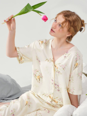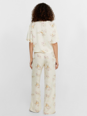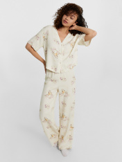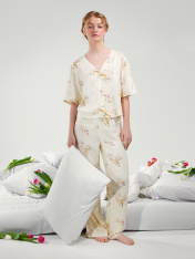 Нежная женская пижама выглядит очень элегантно и комфортно. Жакет свободного силуэта с короткими рукавами и застежкой на пуговицах создаёт легкий и расслабленный образ. А легкие брюки с эластичным поясом обеспечивают дополнительный комфорт и свободудвижений. Изделие выполнено из нежнейшей и приятной к телу вискозы, которая дарит ощущение мягкости и комфорта на протяжении всего дня или ночи. Этот комплект идеален для тех, кто ценит качество и утонченность в домашней одежде.
