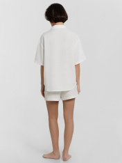 Женская пижама, выполненная из сочетания льна и вискозы. Она сочетает в себе стиль и комфорт, идеально подходя для повседневного ношения дома. Рубашка свободного силуэта с отложным воротником и короткими рукавами имеет центральную застежку на пуговицах, что обеспечивает удобство и легкость в носке. Шорты свободного кроя с высокой посадкой и карманами в боковых швах добавляют практичности и комфорта. Модель выполнена из натурального льна и вискозы. Такое сочетание материалов обеспечивает оптимальный комфорт и долговечность. Лён - это натуральный материал, который обладает отличными дышащими свойствами и дарит прохладу в жаркие дни. Вискоза, в свою очередь, добавляет мягкости и шелковистости, делая изделие особенно приятным к телу. Эта пижама станет вашим любимым выбором для уютных вечеров и расслабленного отдыха дома.