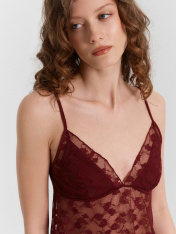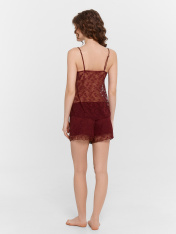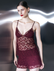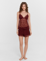 Ощутите истинную нежность нашем новом кружевном комплекте для сна. Топ полуприлегающего силуэта идеально подчеркивает фигуру, а V-образная горловина придает образу изящность. Регулируемые бретели с силиконовой тесьмой внутри обеспечивают максимальный комфорт, а спинка из кружева добавляет нотку романтичности. Также силиконовая тесьма в боковых деталях чашек и спинки гарантирует дополнительную поддержку. Шортики мини позволяют свободно двигаться и ощущать легкость. А нижние детали из микрофибры,обработанные в подгибку, гарантируют мягкость и долговечность. Такой комплект идеально подходит как для повседневного ношения, так и для особенных моментов. Почувствуйте себя уверенной и привлекательной в кружевном комплекте от Mark Formelle.
