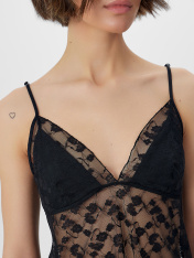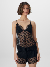 Ощутите истинную нежность нашем новом кружевном комплекте для сна. Топ полуприлегающего силуэта идеально подчеркивает фигуру, а V-образная горловина придает образу изящность. Регулируемые бретели с силиконовой тесьмой внутри обеспечивают максимальный комфорт, а спинка из кружева добавляет нотку романтичности. Также силиконовая тесьма в боковых деталях чашек и спинки гарантирует дополнительную поддержку. Шортики мини позволяют свободно двигаться и ощущать легкость. А нижние детали из микрофибры,обработанные в подгибку, гарантируют мягкость и долговечность. Такой комплект идеально подходит как для повседневного ношения, так и для особенных моментов. Почувствуйте себя уверенной и привлекательной в кружевном комплекте от Mark Formelle. _x000D_