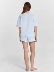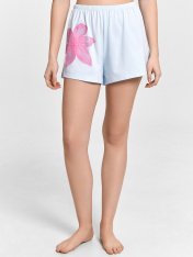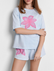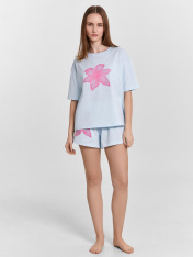 Эта женская пижама — воплощение комфорта и уюта! Джемпер свободного силуэта с круглой горловиной обеспечивает расслабленную посадку. Свободные рукава со спущенной линией плеча добавляют модели непринужденности и удобства. Низ джемпера обработан швомвподгибку, что подчеркивает качественную отделку изделия. Шорты свободного силуэта, короткие, идеально дополняют комплект, создавая легкий и практичный образ. Эластичный пояс обеспечивает комфорт и надежную посадку, а обработка низа шорт швом вподгибку делает их долговечными и аккуратными. Эта пижама выполнена из хлопковой кулирки — мягкого, дышащего и приятного к телу материала, который дарит ощущение комфорта на весь день.Такой комплект станет отличным выбором для домашнего отдыха, позволяя вам чувствовать себя уютно и свободно!