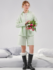 Этот женский домашний комплект, включающий рубашку и шорты, станет отличным выбором для стильного и удобного образа. Рубашка свободного силуэта с классическим отложным воротником, спущенным плечом и длинными рукавами придаёт расслабленный вид. Центральная застежка на пуговицах и накладной карман на груди добавляют функциональности и практичности. Шорты свободного силуэта, удлиненные, с эластичным поясом обеспечивают комфорт и свободу движений, делая их идеальными для повседневной носки и отдыха. Комплект выполнен из лёгкого и дышащего материала, который обеспечивает комфорт на протяжении всего дня. Наслаждайтесь комфортом и стилем каждый день!