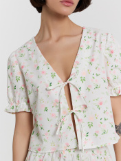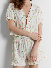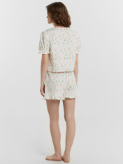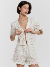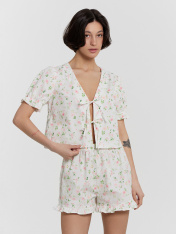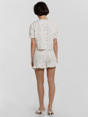 Жакет свободного силуэта. Горловина V-образной формы. Центральная застежка на завязках. Рукав втачной, короткий, фонарик с резинкой 6RV. Низ жакета и рукавов обработан вподгибку. Шорты свободного силуэта, укороченные, с посадкой на талии. Пояс цельнокроеный, с втачной эластичной тесьмой 30RV. В низу шорт рюши, обработанные в подгибку.