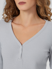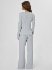 Домашняя пижама для женщин, состоящая из джемпера и брюк, создает гармоничный образ для уютного отдыха. Приталенный джемпер с изящным V-образным вырезом мягко подчеркивает силуэт, а длинные рукава обеспечивают комфорт. Элегантную деталь добавляет застежка на кнопки по переду, которая не только функциональна, но и становится стильным акцентом.<br>_x000D_ <br>_x000D_ Брюки прямого кроя со средней посадкой удобно сидят на фигуре благодаря широкому поясу с эластичной тесьмой. Все срезы изделий тщательно обработаны, что подчеркивает внимание к качеству исполнения. Мягкий хлопковый материал с добавлением эластана нежно облегает тело, позволяя коже дышать, и сохраняет форму даже после стирок. Этот комплект станет воплощением домашнего уюта, где каждая детальпродумана для вашего расслабления и прекрасного самочувствия._x000D_ _x000D_ _x000D_ _x000D_ _x000D_