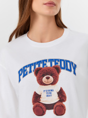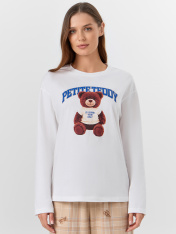 Пижама женская с надписью «Медвежонок» и очаровательным принтом маленького мишки создана для моментов уютного отдыха. Пижама состоит из джемпера прямого кроя и прямых брюк, полностью выполненных из натурального хлопка. Джемпер с круглой горловиной идлинными рукавами обеспечивает комфорт, а брюки с эластичным поясом на шнурке удобно сидят по фигуре, не стесняя движений._x000D_ Мягкая хлопковая ткань обеспечивает идеальную терморегуляцию: согревает в прохладное время и сохраняет ощущение свежести в теплые вечера. Натуральный материал гарантирует воздухообмен и нежность при контакте с кожей. <br>_x000D_ <br>_x000D_ Комплект подойдет для прохладных вечеров — в нем вы будете чувствовать себя уютно и расслабленно. Нежный принт с мишкой и тематическая надпись добавят домашнему образу тепла и беззаботности, создавая настроение для спокойного сна или неспешного утра._x000D_ _x000D_ _x000D_ _x000D_ _x000D_