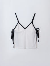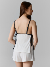 Комплект состоит из блузы и шорт. Блуза прямая свободня, на бретелях. Горловина V-образной формы. По переду подрез под грудью. Лиф на подкладке из основного полотна. Горловина переда и спинки, проймы, боковые швы, окантованы бейками из велюра. Бейкипо проймам переходят в бретели с регулировкой на металлические регуляторы (AL-810E) и кольца, шириной 10мм. По бокам завязки из велюра. Нижний срез блузы обработан швом вподгибку. Шорты свободного силуэта, посадка средняя. Пояс цельнокроеный с эластичной тесьмой внутри (внутр. 10мм 10RV). В боковых швах канты из велюра. Нижний срез шорт обработан швом вподгибку.