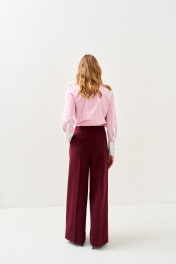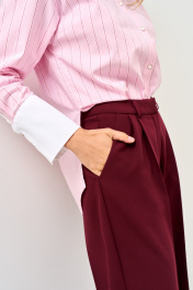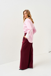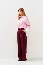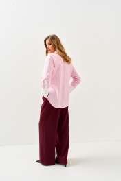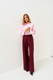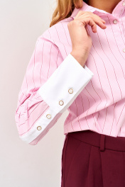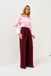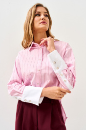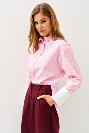 Блузка женская прямого силуэта с центральной бортовой застежкой на петли пуговицы,отложным воротником, со спущенным рукавом. Низ рукава обработан притачной манжетой. В боковых швах обработаны разрезы. Низ изделия ассиметричный