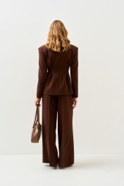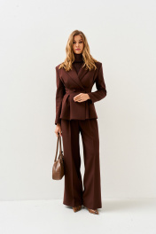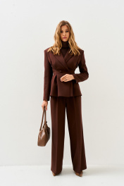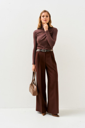 Брюки женские свободного кроя, расширенные к низу. На передних половинках брюк обработаны боковые карманы в швах.Застежка на тесьму молния с потайной пуговицей и брючным крючком. Пояс брюк обрабатывается корсажной тесьмой. По поясу настрочены шлевки для ремня. По передней половинке заложены две складки, одна из которых переходит в застроченный кант . Задние половинки с вытачками и заутюжеными кантами. длина изделия 112см ,обьем по бедрам 102-106-110-114-118-122-126, обьем талии 66-70-74-78-82-86-90