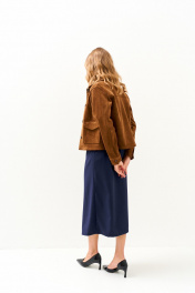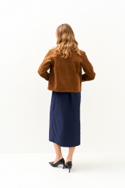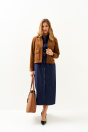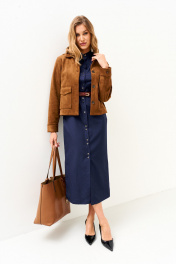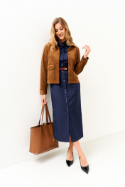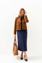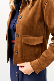 Жакет женский на подкладке с центральной бортовой застежкой на петли, пуговицы. Воротник стояче отложной. Рукав втачной двухшовный с притачной манжетой с застежкой на петли пуговицы. . На деталях переда обработаны накладные карманы с клапанами.