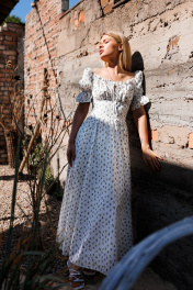 Платье отрезное по линии талии. Верхняя часть с отрезным лифом, подрез фигурный. По верхнему краю лифа кулиска, в которую вставленны завязки формирующие драпировку. В верхней части среднего шва спинки застежка на потайную молнию. Рукав длинный, объемный, на уровне выше локтя сборки выполненные посредством эластичных строчек ниткой и резинкой. Разрез по передней половине платья. Платье на хлопковой подкладке. Длинна юбки от талии-95 см.Длина рукава - 34 см. Длина по спине - 119-123 см
