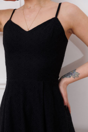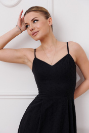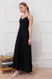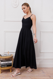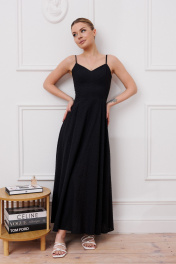 Платье на подкладке умеренного объема приталенного силуэта, отрезного по линии талии: прилегающее в верхней части, умеренно расклешенная юбка, по линии талии 2 складки. На верхней части полочки нагрудные рельефы. Вырез горловины фигурный. Застежка на потойную молнию по спинке. Бретели на регулировке. Длина изделия по боковому шву 117 см. Замеры готового изделия 48 размер : ОГ= 98 см, ОТ = 83 см , 50 размер:ОГ = 102 см,ОТ =87 см, 52 размер : ОГ=106 см, ОТ =90 см