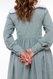 Притягательное платье умеренного объема приталенного силуэта, отрезного по талии. На верхней части полочки нагрудные вытачки. На верхней части спинки талиевые вытачки. Нижняя часть платья объемная. Объем создан за счет сборки на юбке. Вырез горловины глубокий V-образной формы. Воротник отложной, декоротивный. Застежка платья центральная на петли и пуговицы. Рукав длинный втачной . Ткань идет вареный хлопок-называется так, потому что прошла обработку горячей водой(энзимную стирку). Благодаря энзимной стирке на ткани образуется легкий неравномерный краш - эффект. Длина юбки от талии 95 см. Длина по спинке 134 см.