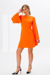 Платье «Фламинго» приталенного силуэта. Легкое платье малого объема, отрезное по талии, с нагрудными и талиевыми вытачками. Спинка украшена фигурным вырезом и открытой деталью на уровне талии. Горловина округлая, с застежкой на петлю и пуговицу сзади. Рукава длинные, втачные, с эффектным расширением к низу. В среднем шве спинки предусмотрена потайная молния. Длина платья — выше колена. Длина рукава - 58-62. Длина юбки - 50 см