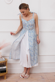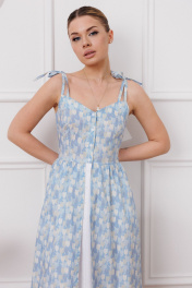 Платье "Изабелла" миди на бретелях .Элегантное платье длиной миди, отрезное по талии. Лиф с нагрудными и талиевыми вытачками, по спинке резинка-венгерка для комфортной посадки. Бретели: две спереди и одна сзади, завязываются на бант. Центральная застежка на пуговицы. Юбка двойная, с изящной сборкой на талии: нижний слой дополнен пуговицами и рюшей по низу. Идеальный выбор для стильного летнего образа.Длина юбки 80-82 см Длина платья по боковому шву - 97-100 см
