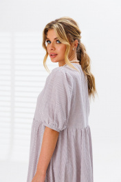 Платье расширенного силуэта с воланами. Стильное платье с втачным рукавом и отрезными воланами. Полочка и спинка отрезные по талии, с притачной планкой для застежки на пуговицы. Рукав объемный, до локтя, с мягкой сборкой по окату и низу, дополнен узкими манжетами. Два отрезных волана, собранных на сборку, добавляют изысканности. Длина платья — до середины икры. Ткань идет вареный хлопок-называется так, потому что прошла обработку горячей водой(энзимную стирку). Благодаря энзимной стирке на ткани образуется легкий неравномерный краш - эффект. Длина по спинке - 118-120 см,Длина платья по переду от точки основания шеи - 123 см, длина рукава - 33-34см.