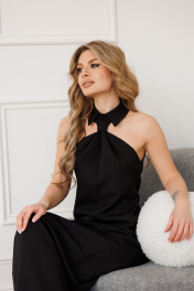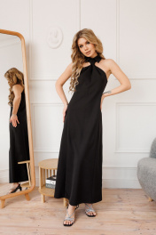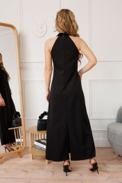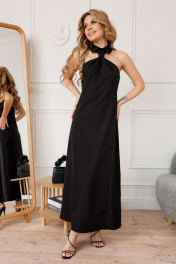 Платье малого объема, полуприлегающего силуэта, с небольшим расширением к низу, без рукавов, без подкладки, длиной в пол. Плечевые швы отсутствуют. Горловина переда обработана стояче-отложным воротником с отрезной стойкой, с застежкой на 2 навесные петли и 2 пуговицы, расположенные сзади стойки. Длина изделия по боковому щву - 112 -115 см