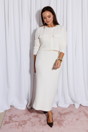 "Юбка миди прямого силуэта с цельнокроеной обтачкой на резинке. Низ юбки обработан в подгибку на машине.Жакет прямого силуэта умеренного объема, с центральной застежкой на планке с прорезными петлями и пуговицы. В верхней части переда накладные клапаны. Рукав одношовный, . Изделие без подкладки. . Изделие укороченное до уровня талии. На фото 46 размер Длина топа по спинке 40 см, длина рукава 58-59 см . Длина юбки 93 см"