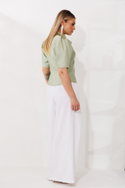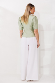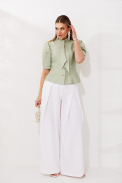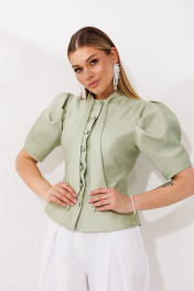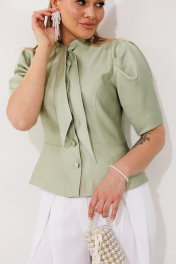 Жакет приталенного силуэта, умеренного объема, отрезного по линии талии.. Рукав укороченный, в верхней части оформлен крупными складками. Горловина обработана воротником с удлиненными концами, выполненными в форме банта-галстука. Застежка центральная на обметанные петли и пуговицы. Изделие выполнено на подкладке. Длина жакета — выше линии бедер.