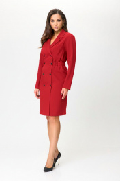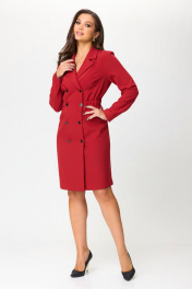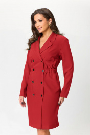 Платье полуприлегающего силуэта с длинным втачным рукавом с цельнокроеной двубортной застежкой на петли и пуговицы. Перед с отложными лацканами заостренной формы, с нагрудной и талиевой вытачками кокетки. В шов талиевой вытачки переда и спинки вставлена кулиса с проложением эластичной тесьмы. Воротник втачной, отложной. Спинка с центральным швом и вытачкой от линии кокетки. Рукава втачные, двушовные. Низ изделия и рукавов подогнуты.