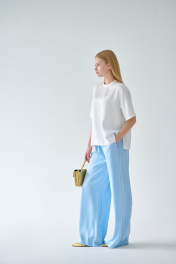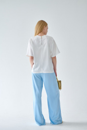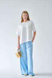 Брюки палаццо из струящейся, шелковистой, тактильно приятной ткани для неповторимых образов. Для вашего удобства верх брюк обработан притачным поясом с резинкой, а в верхней части расположены боковые карманы. Свободный крой, фактура ткани - всё это делает брюки абсолютно универсальными. Они обеспечат непревзойдённое чувство комфорта в повседневной носке и на любом мероприятии. Деликатная ткань не выгорает, не пилингуется, а благородный блеск добавляет особого шика. Брюки не один сезон будут №1 в вашем гардеробе. Рекомендации по уходу - на этикетке. Размеры соответствуют стандартной размерной сетке. Дополнительные замеры: Длина брюк по боковому шву от пояса 104см. Высота пояса 4см.