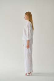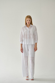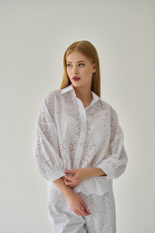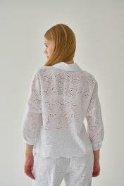 Блузка из 100% хлопка «ришелье» - настоящая находка в жаркий летний сезон! Не сковывающий движений свободный крой, спущенный рукав 3/4 – все это добавит комфорта в носке. Классический отложной воротник на стойке, по переду застёжка на петли и пуговицы, манжеты выполнены из однотонного 100% хлопка, что делает изделие более износостойким и универсальным. Изюминка - в фигурном крае по низу блузки. Эта особенность позволит любому вашему образу стать уникальным. При желании вы можете собрать комплект, скомбинировав блузку с прямыми брюками с фигурным низом (модель 852с). Легкость, воздухопроницаемость и гигроскопичность обеспечиваются за счет натуральности состава ткани нашего изделия, способного по праву занять первое место в вашем гардеробе! Рекомендации по уходу - на этикетке. Размеры соответствуют стандартной размерной сетке. Дополнительные замеры: Длина рукава 32см. Длина изделия 56см.