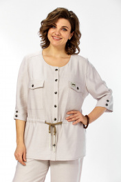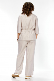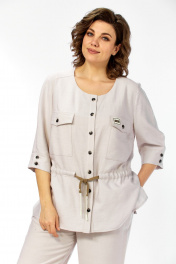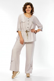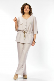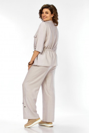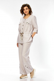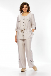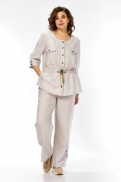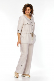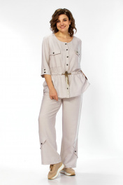 Комплект женский 2-х предм., состоящий из блузона и брюк. Блузон с центральной застежкой на петли-пуговицы. Полочка с накладными карманами по груди, карманы с клапанами на петлю-пуговицу, на левом имеется декоративная нашивка. По линии талии кулиса с завязывающимся поясом. Рукав 3/4 с манжетами, манжеты с застежкой на пуговицу. По переду и спинке, вдоль линии плеча имеются отрезные кокетки. Брюки свободного кроя, с поясом на частичной резинке, карианами в боковых швах. По низу переда брюк имеются декоративные диагональные подрезы, отдекорированные пуговицами