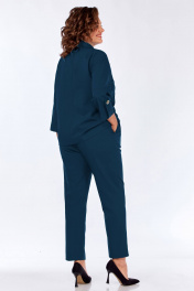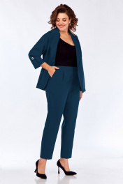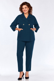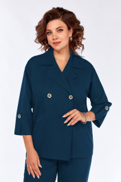 Комплект женский 2-х предметный, состоящий из жакета и брюк. Жакет без подкладки, с двубортной застежкой, воротником пиджачного типа. Перед с диагональными подрезами от боковых швов до подборта, в подрезах имеются функциональные карманы. Спинка со средним швом. Рукав втачной, одношовный на спущенной линии плеча. Длина рукава 3/4, с отрезной широкой манжетой, присобирается на пату с застежкой на петлю-пуговицу. Брюки полной длины, слегка заужены к низу, со складками от отрезного пояса по переду, карманами-хулиганами в боковых швах. По спинке, в пояс брюк вставлена резинка.