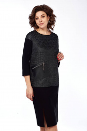 Комплект женский прямого силуэта, состоит из блузы и юбки. Блуза свободного покроя со спущенной линией плеча, рукав втачной, двухшовный 3/4 с отложной манжетой. Горловина круглая на бейке. На полочке с принтованного трикотажа нагрудные вытачки косые с проймы; один накладной карман из трикотажа с напылением, с застежкой на декоративную молнию. Спинка цельная. Юбка полуприлегающего силуэта верхний срез обработан обтачкой. Талиевые вытачки на заднем полотнище. Потайная тесьма-молния и разрез в среднем шве. Длина блузы по спинке 63 см, длина рукава 35,5 см, ширина рукава на уровне глубины проймы 52-40 см, 54-42 см,56-44 см. Длина юбки по переду 60 см.