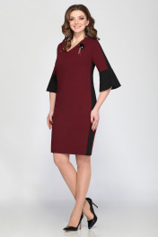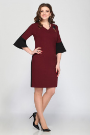 Платье женское полуприлегающего силуэта. Вырез горловины V-образный. По боковым швам отделочная деталь из контрасной ткани, такая же деталь по центру рукава. Рукав с широким валаном из отделочной контрастной ткани. Низ волана обработан швом в подгибку с открытым срезом, без обметки. Длина платья по спинке 101см, длина рукава 41см. Брошь в комплекте.