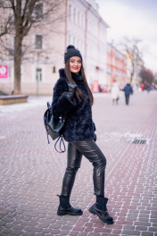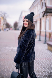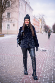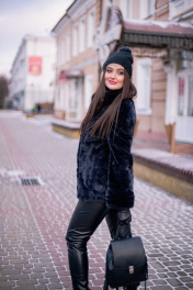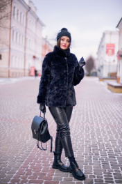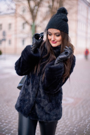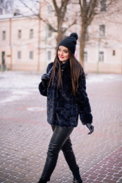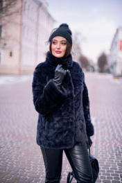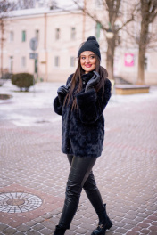 Куртка Ольга 70, выполненная из лоскута норки (форма кусочков - треугольники). Длина изделия: 70 см. Прямой силуэт, по низу изделия вшита кулиска с фиксаторами. Рукава полуреглан с плечевыми накладками. Манжеты рукавов, воротник-стойка и планка выполнены из хвостиков норки (Более пушистые и длинноворсные). На двух концах воротника установлены магниты для фиксации в закрытом виде. Прорезные карманы по бокам. Изделие застегивается на пуговицу в районе воротника, ниже по всей длине изделия - шубные крючки.