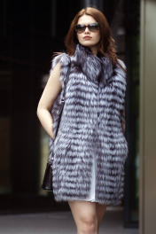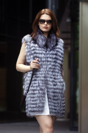Жилет 171 прямого силуэта, выполнен из серебристо-черной лисы росшит кожей и замшей. Длина - 80 см. Воротник отсутсвует. Прорезные карманы по бокам. Застегивается на крючки.
