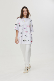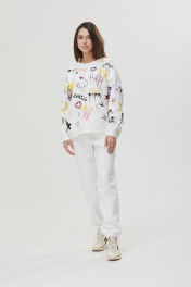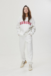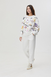 Джоггеры свободного силуэта умеренно зауженные к низу, представлены в четырёх цветах. Выполнены из трикотажного полотна футер 3-х нитка с начёсом. Передние части с фигурными карманами и имитацией застёжки. На задней правой части накладной карман, декоративный флажок с печатью. Пояс и низ на эластичной тесьме. Такие джоггеры универсальны для прогулок, путешествий, спорта и дома.