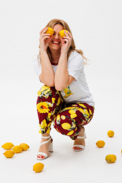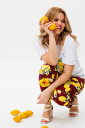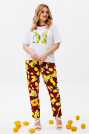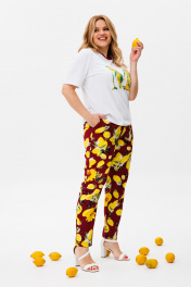 Универсальный и удобный женский брючный комплект для повседневной носки. Футболка свободного кроя, выполнена из мягкой приятной на ощупь хлопковой ткани. Округлая контрастная горловина, рукав укороченный, перед и спинка прямые. По переду изделие украшено принтом. Футболку с легкостью можно носить как навыпуск, так и заправленной. Брюки выполнены из хлопковой ткани средней плотности, длина 7/8, слегка звужены к низу, по верху на притачном поясе с резинкой по бокам. По переду с двумя боковыми карманами в швах и центральной застежкой на молнию и пуговицу. Универсальность кроя и легкая ткань сделают его любимым изделием Вашего гардероба в летний сезон. Длина футболки по спинке 60 см, длина рукава от плечевого шва 28 см. Длина брюк по боковому шву 96 см, по шаговому 72 см. Изделие подойдет на рост 170 см.